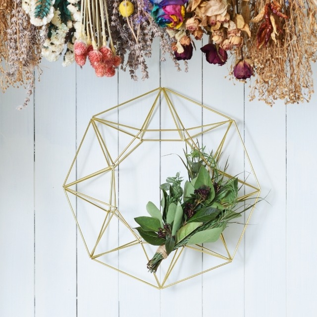 キラキラ金色に光る真鍮製ヒンメリ リース(M)受注製作品のページです。 Mサイズは直径36cmで どんな広さのお部屋にもマッチします。 真鍮パイプは時と共に 色味が優しい風合いになり アンティークな雰囲気も お楽しみいただけます。 ※受注製作品の為、ご注文を頂いてから 10営業日以内(土日祝除く)の 発送となります。 ※リース部分のみの販売となります。 装飾品は付きません。 ※沖縄県・離島への発送は行っておりません。 ************************************************ ヒンメリとは・・・ ヒンメリ(himmeli)はフィンランドの 伝統的なヨウルの装飾品です。 藁に糸を通し、多面体を構成したら 最後にそれらを繋ぎ合わせて吊るします。 別名「光のモビール」と言われています。 【meteori】のヒンメリは藁で作るヒンメリを 金属パイプで製作します。 ************************************************ サイズ:約 縦36cm横36cm厚み8cm 重さ:約200g